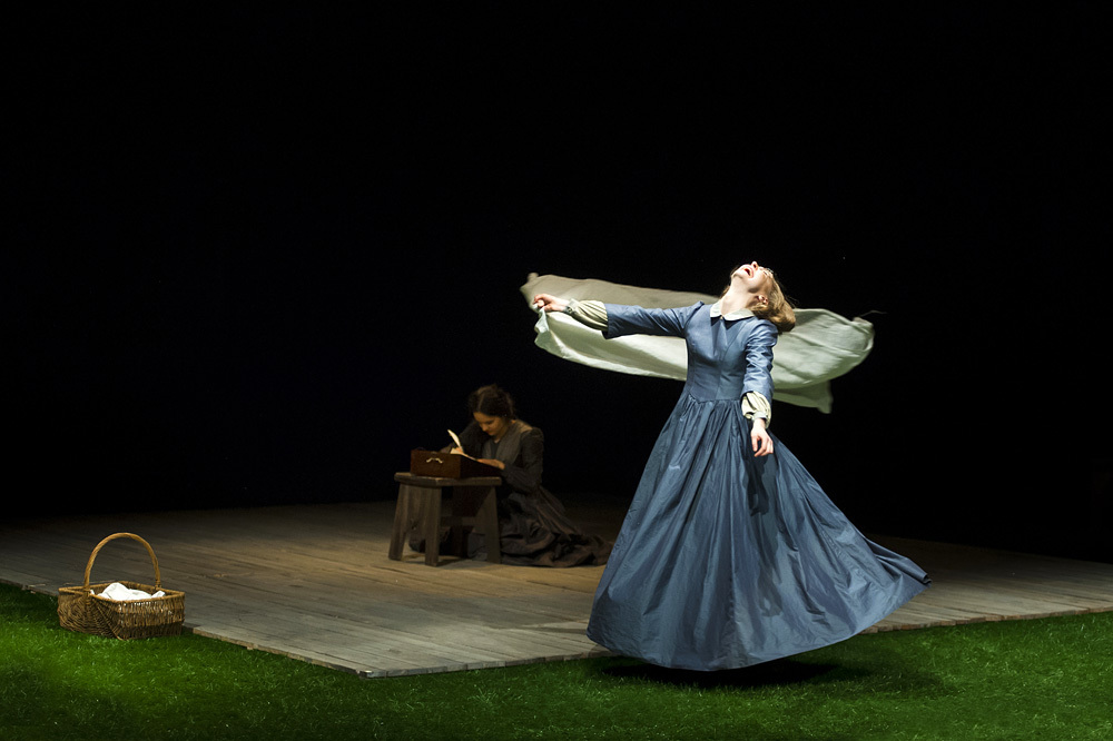 Zaczyna się od przemarszu całego rodzeństwa, krokiem energicznym, szybkim, a nawet półbiegiem, po skosie, z prawej do lewej i na odwrót, z kulisy w kulisę. Co to ma znaczyć? Po co ta defilada? Pokaz dyscypliny na prowincji w wiktoriańskiej Anglii? Obraz reżimu na plebanii starzejącego się pastora Bronte? A może wewnętrzny galop, który siostry podejmą w ucieczce przed szarością dnia, biedą i bratem alkoholikiem? Pogoń za marzeniami, miłością, sławą, pozostawieniem po sobie mocnego śladu? Scena w tym spektaklu wysuwa się ku widowni, na podłodze dzielącej ją od pierwszego rzędu znajduje się murawa – to tutaj Emily Jane będzie się oddawać rytuałom bratania z naturą, a Branwell notować jej gorączkowe zdania, opisujące pejzaż wokół Wichrowych Wzgórz. Siostry będą paradowały ze swoimi skrzyneczkami do pisania, starannie wykorzystywały papier, pokrywany wciąż nowymi zapisami, ale wypełniały codzienne obowiązki: szycie nowych koszul dla ojca i układanie płótna. A na przekór ich szarym, szczelnie pozapinanym sukniom uciekać będą w kolorowe marzenia.
