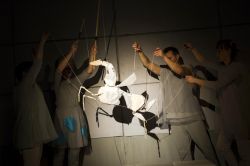 Sceniczny kalejdoskop wiruje. Dźwięk biegnie. Obraz to fruwa, to pełza. Natomiast cel, trasy i kierunki określa przejrzysty układ działań ruchowych. Znakomicie sytuują się tutaj zbliżenia typu stop-klatka, plan improwizacji oraz różnorodne rytmiczne zestawy komponowane na miarę wypowiedzi, partii muzycznych, multimedialnej ramy. Wszystko wsparte precyzyjną aktorską techniką [Aneta Harasimowicz, Agnieszka Mazurek, Magdalena Mioduszewska, Andrzej Perzyna]. Powiedziałabym nawet, że chwilami zbyt mocno precyzyjną, zwłaszcza gdy się prosi pauza na autentyczne rodzinne więzi. Ale może ponosi mnie teatrologiczny wirus, skoro mała widownia żarliwie kibicuje, wspaniale klaszcze, cudownie się cieszy.