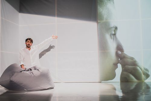 Bohaterowi spektaklu (Piotr Żurawski) wypocząć się jednak nie udaje. Jakby istniała w nim jakaś silna blokada, utrudniająca realizację pragnienia. Wywołująca złość i frustrację, pchająca go w odmęty natrętnych myśli, psychodelicznej imaginacji, której wizualizacje (Hanna Maciąg) wyświetlane są na ścianach scenografii. Osacza go i przytłacza, a jej intensywność sprawia, że bohater przestaje być na scenie dominujący. Rozmywa się w tej przedziwnej mieszaninie jawy i imaginacji. Odgrodzony od świata. Zamknięty w białym kubie, bezpiecznej, pustej, niewielkiej przestrzeni, przywodzącej na myśl salę szpitala psychiatrycznego, której wyposażenie ogranicza się jedynie do szarego siedziska i nawilżacza powietrza ułatwiającego oddychanie w chwilach ataku paniki.