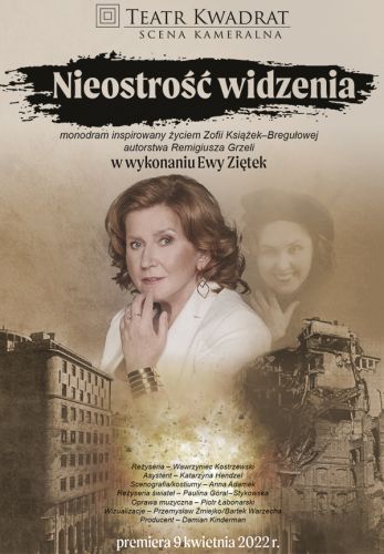 Ewa Ziętek od przeszło 20 lat związana z Teatrem Kwadrat przygotowała monodram z okazji jubileuszu 50-lecia pracy scenicznej. Sztuka „Nieostrość widzenia” w reż. Wawrzyńca Kostrzewskiego według tekstu Remigiusza Grzeli jest historią życia ociemniałej aktorki, poetki i łączniczki AK Zofii Książek-Bregułowej.