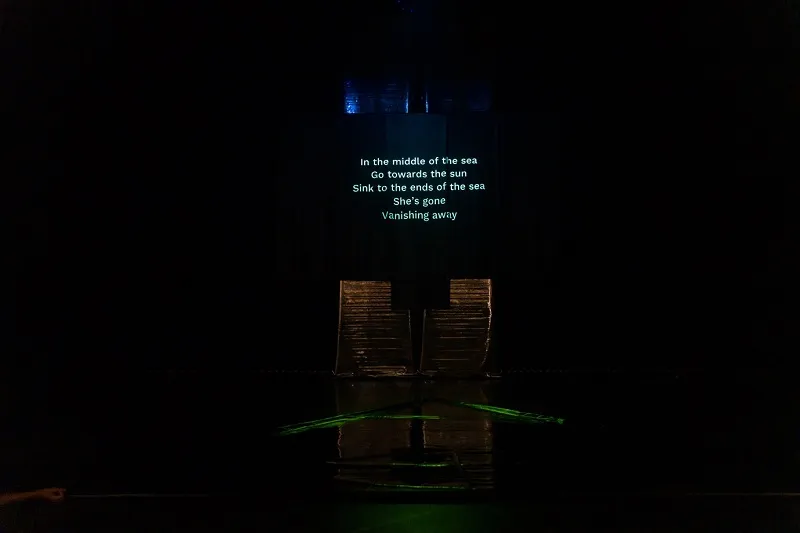 Słowa chwiejnie zawieszone pomiędzy projekcją a kurtyną. PERŁY Joshuy Serafina. Zdjęcie: Andrea Avezzù. Zdjęcie: dzięki uprzejmości La Biennale di Venezia. Dzięki uprzejmości Joshua Serafin