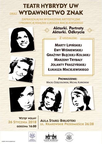 Teatr Hybrydy UW zaprasza 26 stycznia 2018 do auli dawnej Biblioteki UW na spotkanie artystyczne, którego gośćmi będzie pięć aktorek, bohaterek książek znanego krytyka filmowego… Dowiedz się więcej »„Aktorki. Portrety” – wydarzenie artystyczne Teatru Hybrydy